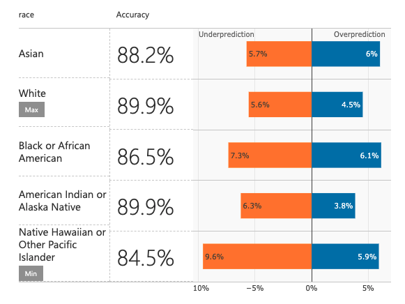 In May of 2016, ProPublica published an informative article on how the Correctional Offender Management Profiling for Alternative Sanctions (COMPAS) tool -used to assess the likelihood of an offender committing a future crime- was biased against blacks. The article found that this algorithm was incorrectly predicting that black defendants were twice as likely to reoffend than white defendants.