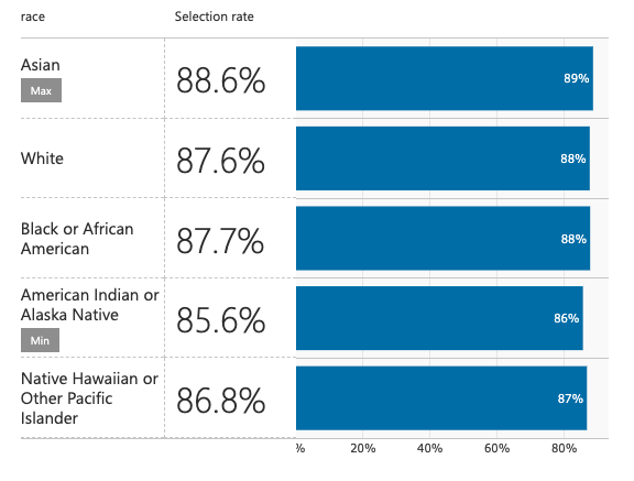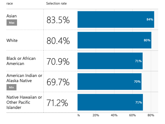 When we consider that this model was built on biased data we recognize that accuracy here means modeling the bias found in the dataset. We see how the model is very accurate across race selection. This also means that the acceptance rates follow the same distribution as those found in the real world. This is a huge problem.